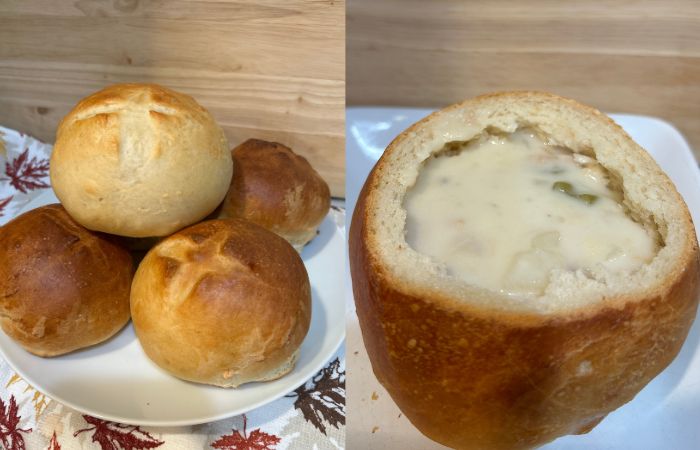 We made homemade bread bowls, clam chowder, baked beans, and a Boston cream pie at home.